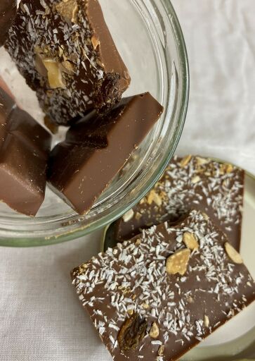 Cacao 37% minimum, Sucre de canne*, beurre de cacao*, poudre de lait entier*, pâte de cacao*, émulsifiant : lécithines de tournesol*, extrait naturel de vanille*, raisins*, amandes torréfiées*, noix de coco rapée*.