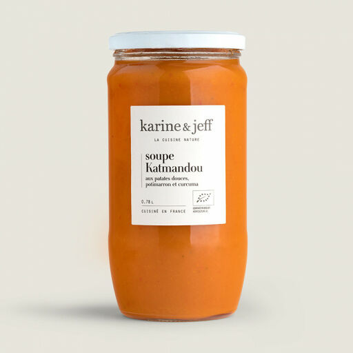 Eau pure du parc régional du Haut-Languedoc, patates douce* (19%), potimarron* (15%|orig. France), poivrons rouges*, carottes* (orig. France), oignons*, sel de Guérande garanti Nature & Progrès, curcuma* (0,1%), coriandre*, piment de Cayenne*, fenugrec*, poivre*, cumin*, moutarde*, fenouil*, ail*, pois chiches*, pois cassés*