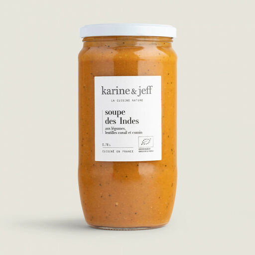 Eau pure du parc régional du Haut-Languedoc, courgettes* (16%), tomates* (15%|orig. France), oignons* (9,6%), poivrons rouges* (9,6%), lentilles corail* (4,8%), petits pois* (3,9%|orig. France), sel de Guérande garanti Nature & Progrès, coriandre*, cumin* (0,1%), fenugrec*, fenouil*, poivre*, cannelle*, cardamome*.