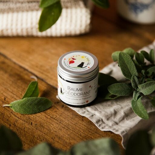 Beurre de karité*, huile de coco équitable*, oxyde de zinc*, fécule de maïs*, huile de jojoba*, argile blanche (Kaolin), huiles essentielles* (Sauge sclarée, Palmarosa), cire de carnauba*