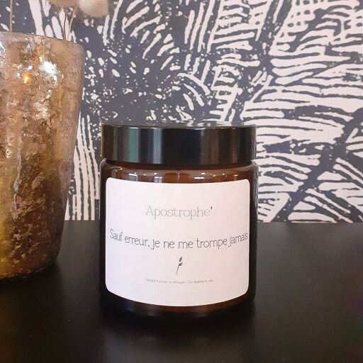 Bougie à citation "Sauf erreur je ne me trompe jamais" senteur Figue noireLes bougies Apostrophe sont fabriqué à Baulon en Bretagne, à la main et se composent à 100% de cire végétale de soja sans OGM et non testée sur les animaux. De plus, cette cire est 100% biodégradable et non nocive pour notre santé.
