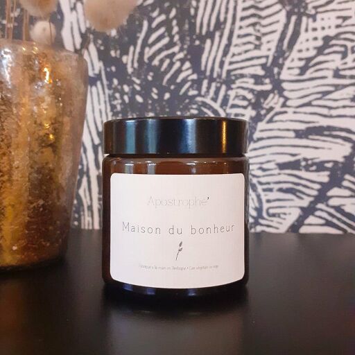 Bougie à citation "Maison du bonheur" senteur Cèdre BlancLes bougies Apostrophe sont fabriqué à Baulon en Bretagne, à la main et se composent à 100% de cire végétale de soja sans OGM et non testée sur les animaux. De plus, cette cire est 100% biodégradable et non nocive pour notre santé.