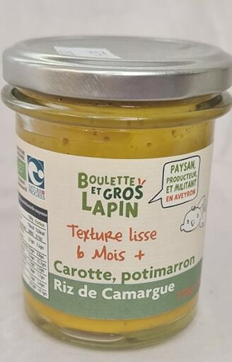 Ce Petit Pot Carotte Potimarron Riz de Camargue Boulette et Gros Lapin a été réalisé à partir de legumes cultivés en plein champ et cuisinés frais, auxquels est rajouté du riz cultivé en Camargue.
