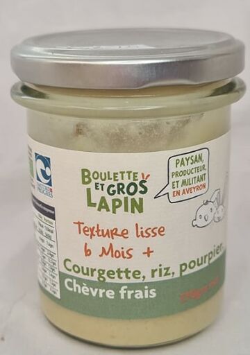 Eau de cuisson, courgette* 39%, riz du domaine de Beaujeu* 7%, fromage de chèvre frais du Gaec du chèvre d'Olt* (4% lait de chèvre*, ferments lactiques*, présure, sel), huile d'olive du moulin Olifix*, pourpier* 1%.